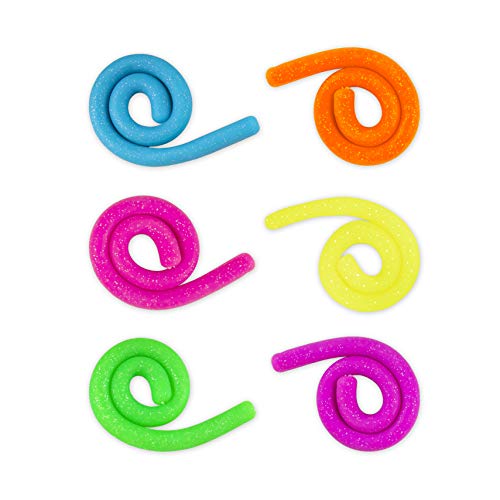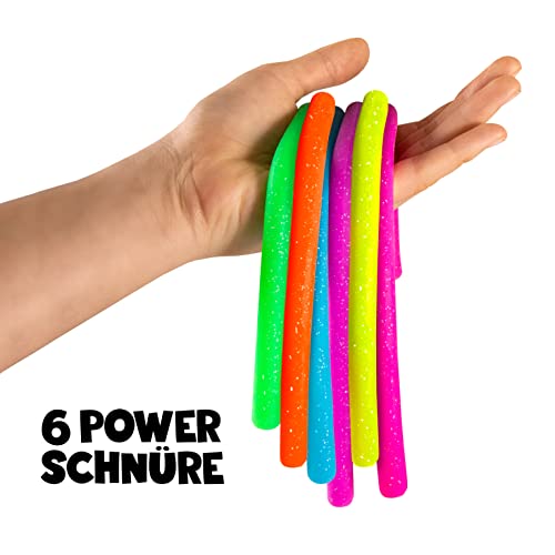 Kleurrijke set – de grappige anti-stress koorden in de glinsterende kleuren worden geleverd in een kleurrijke verpakking van 6 stuks. De kleuren blauw, roze, geel, groen, paars, oranje. De powerkoorden zijn elk 30 cm lang